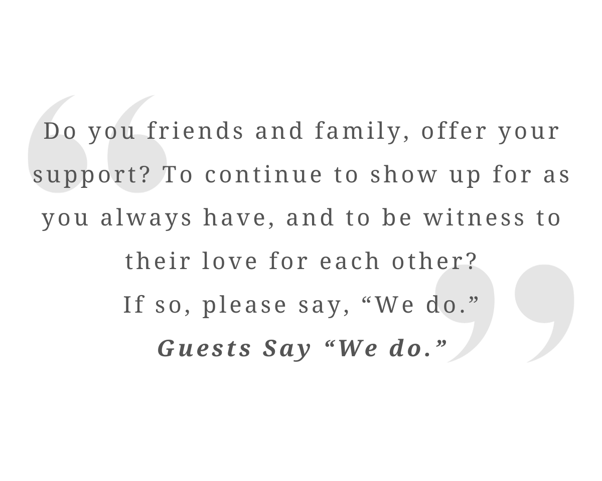 The community vow follows the statement of intent. This is when the officiant calls to the guests a prompt for them to respond with "WE DO!".
